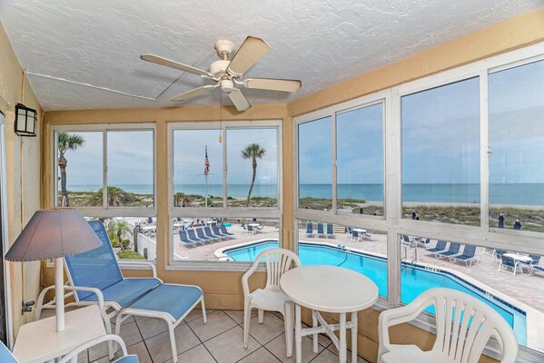 Unit 203 is an Ocean Front Unit on the second floor with 2 Bedrooms (inlcuding a king and 2 twin beds) and 2 full Bathrooms and it has a full kitchen, living room, and dining room as well.  Walk out your front door to paradise, no shoes needed!